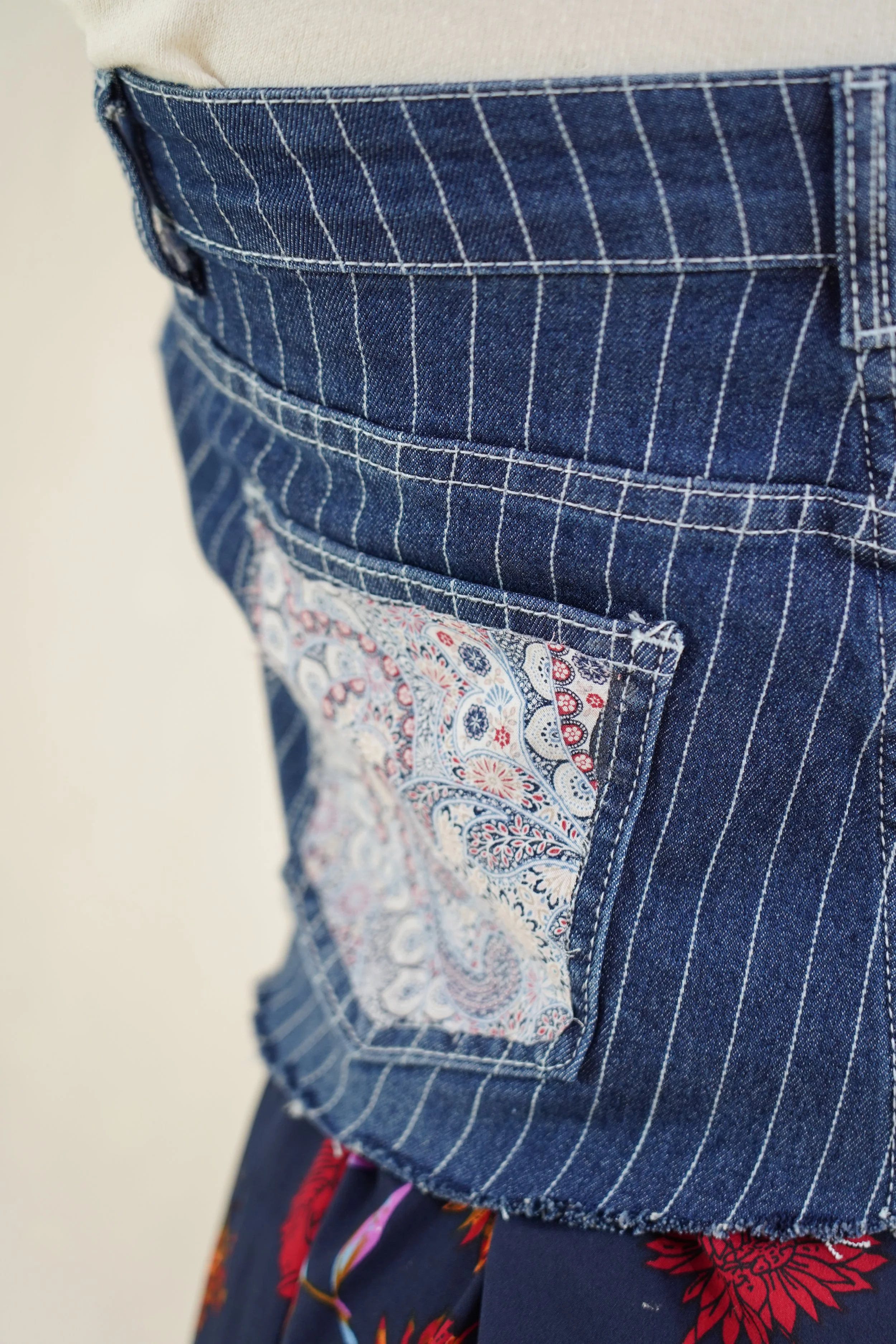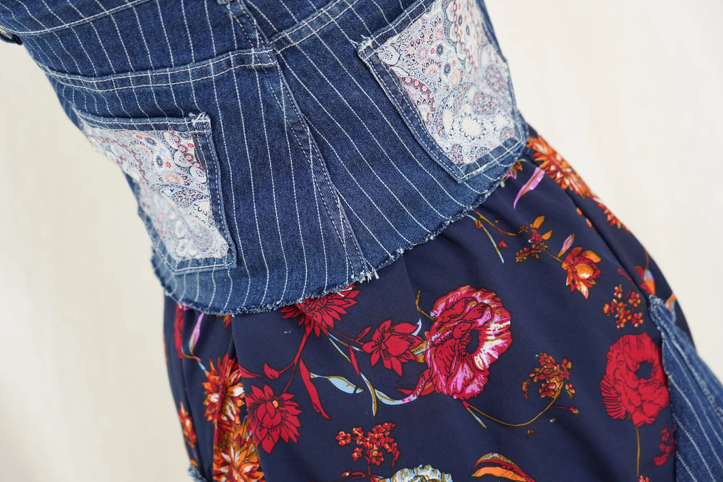 They started by transforming the floral dress into a skirt base, carefully adding triangle denim panels from the jeans. They preserved the frayed edges for extra texture and character. The jeans' waistband became a fitted top, shaped with darts for a more tailored fit.